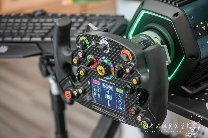 這方向盤最厲害的是,還包含了一塊4.3吋的彩色螢幕,可以顯示車輛的內容,另外上面有21顆LED指示燈,其中16顆代表換檔燈號,另外五顆則是顯示賽道的旗號。方向盤上面有很多按鈕,加上旋鈕,所有功能都可以自訂義,但功能太多了…,其實也用不著學啦!來米特3C體驗,就是輕鬆玩玩,會踩油門跟煞車就好~
