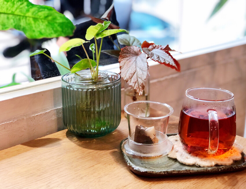 走上台階的門面滿佈綠色植栽的嶼人Café,彷彿擁擠城市的一處秘境。舉凡鹿角蕨、曼綠絨、龜背芋、火鶴、觀音蓮、山烏龜等觀葉植物讓人美不勝收,看著植物綠意盎然的生命力,加持了不少的正能量。