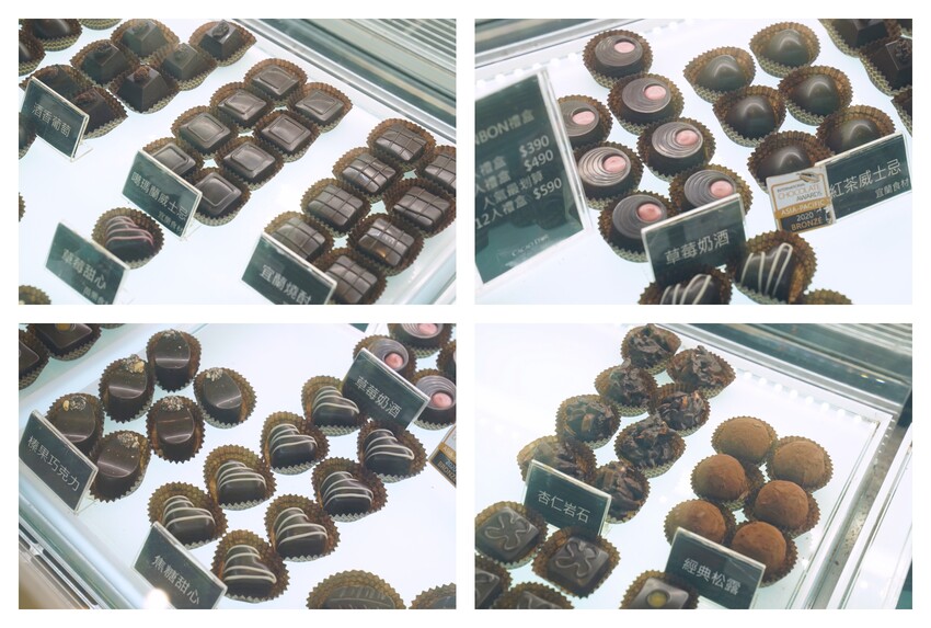 ▼目前販售的巧克力有「BONBON 禮盒」、「巧克力磚」、「生巧克力」、「片狀巧克力」幾大類。櫃檯上擺的巧克力都是從櫃檯旁的工作室製作出來的,店家有自己的調溫室,讓客人隨時都能買到好品質的巧克力。