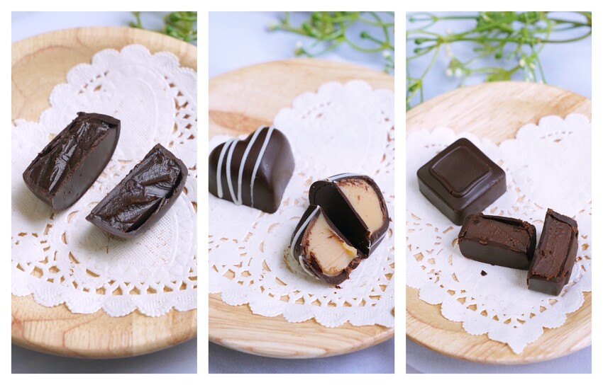 ▼濃醇咖啡口味的咖啡香味豐厚,用牛奶巧克力與咖啡調和,味道圓潤且有悠長餘韻有軟 Q 感。焦糖甜心比較不像其他口味有成熟的大人味,咬開巧克力有如絲綢般香滑細膩的焦糖內餡。葛瑪蘭威士忌酒香厚實,還有淡淡的木質香味。