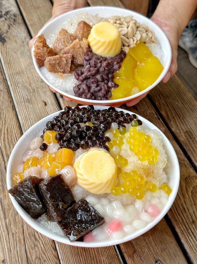 手工布丁不用額外加價也能點,就是比較古早味布丁的那種。紅豆也是推薦必點,顆顆飽滿且鬆軟不甜膩。軟花生就像花生仁湯的味道,稍微咬一下就化開,還帶有香甜的奶香。