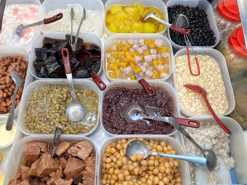 原味粉粿口感很Q彈,而黑糖粉粿相較扎實一些,黑糖香氣很夠,各有各的特色。比較新穎的配料是爆爆珠,不管外型還是口感都很像鮭魚卵,會有爆漿的口感,有養樂多、百香果兩種口味選擇,特別深受小朋友的喜歡。湯圓軟Q的口感也很討喜!