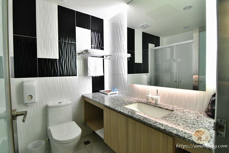 客房內的衛浴是乾濕分離設計,空間明亮舒適,有寬敞的洗手台和化妝鏡,不會讓人有壓迫感,熱水出水量大且加熱速度快,吹風機也不是傳統壁掛式,讓人第一眼就很喜歡。