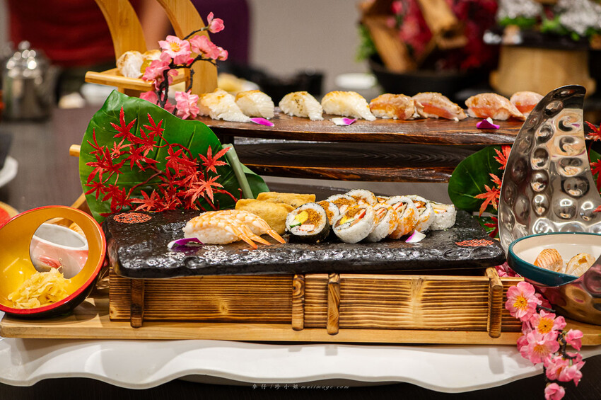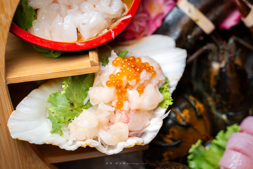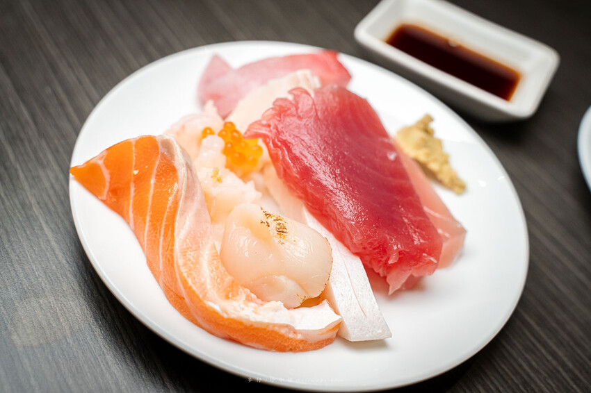 裡面有鮭魚、旗魚、海鱺魚、鮪魚、紅甘魚跟日本生食級干貝,這樣的擺盤真的不知該如何下手了。