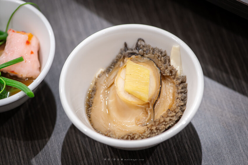 這白鮑魚個頭真的有夠大,瞬間覺得這碗好小。鮑魚經過酒蒸後香氣更迷人。