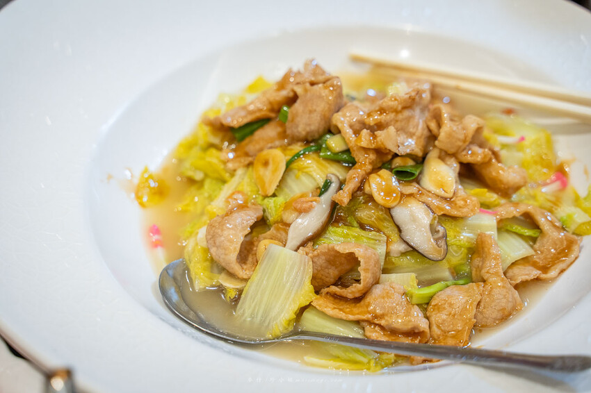 吃了前面那麼多的山珍海味,真的要來點蔬食均衡一下。但上面還是滿滿的松阪豬,彈牙的口感鹹香好吃,又想要來碗飯來配肉了。