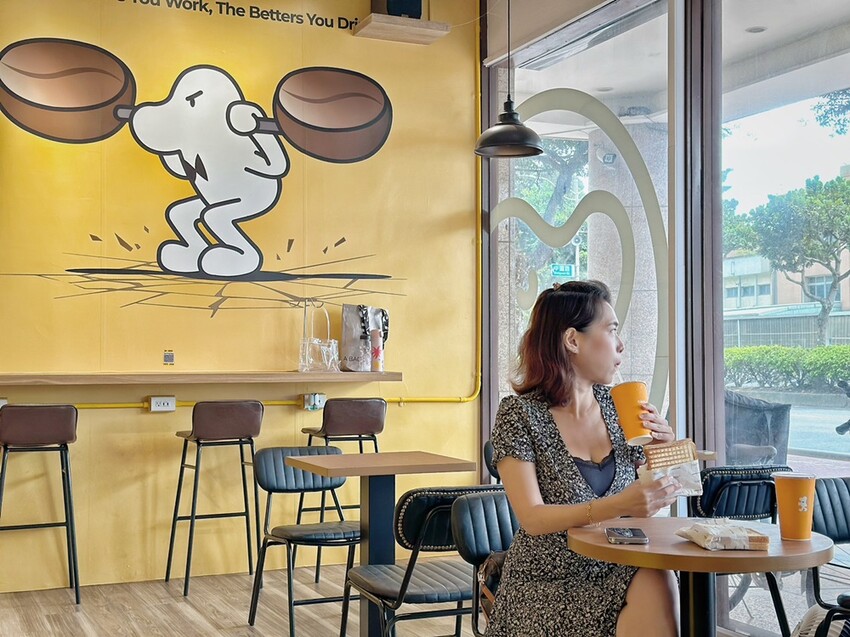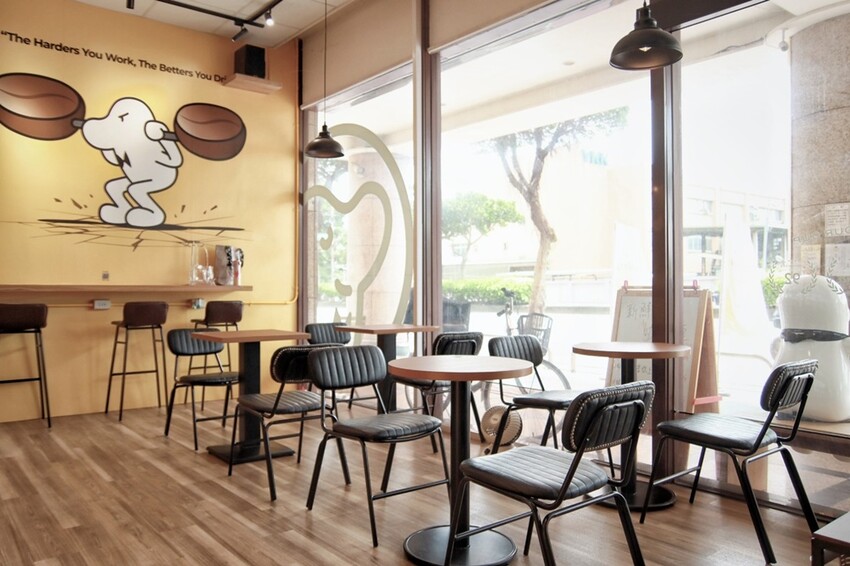cama café中壢健工店就在健身工廠旁,牆上的Beano就設計了在健身運動的要子,這深受健身運動愛好者的喜歡,就連Ann看到也真的覺得可愛極了,cama café中壢健工店也是不少健身族在空檔時間會來這點選個飲品放鬆休息的好去處!