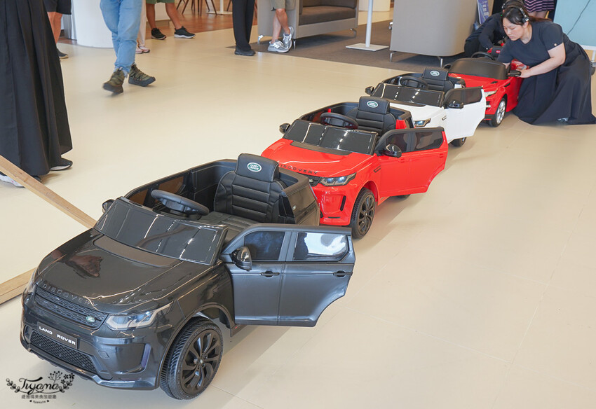 上路駕駛的是 Discovery sport、Range Rover Evoque、 Jaguar F-TYPE 的兒童電動車,每台都帥氣的等待車主上車中