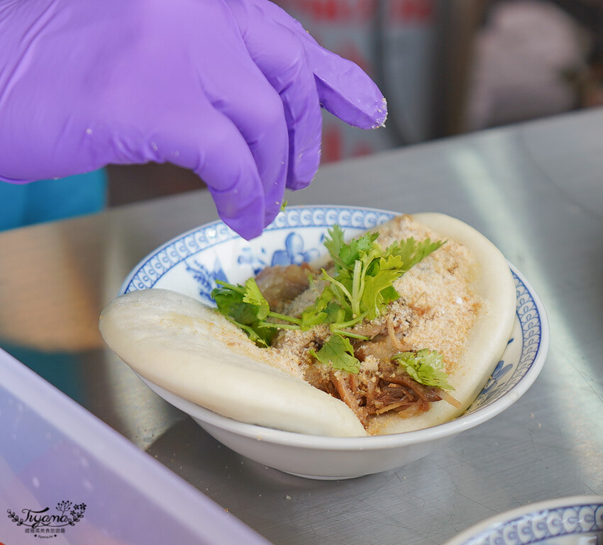經典組合「招牌腿庫刈包」,我很愛吃腿庫飯…腿庫刈包還是第一次吃到,腿庫加上滷筍,再放進花生糖、香菜…就完成。