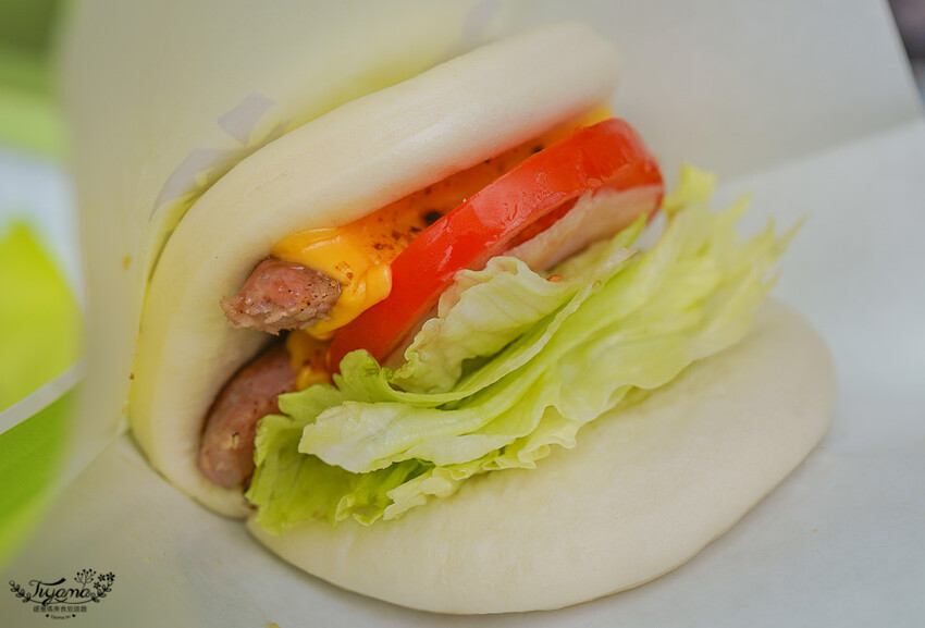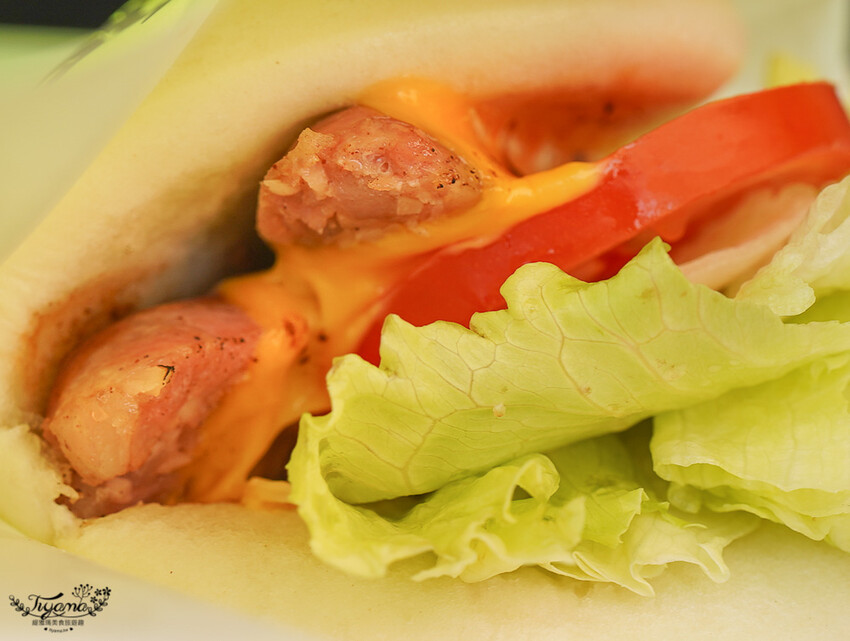 意外的是還加入起司片來豐富口感,這是台式與中式融合的創新組合,在香腸上放了一片起司再炙燒,同樣放上生菜、番茄片。