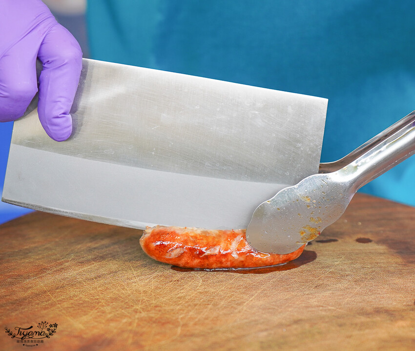 古早味的「廟口阿伯的蒜味香腸」,蒜味香腸是現點現煎,對切開來香腸會爆汁。
