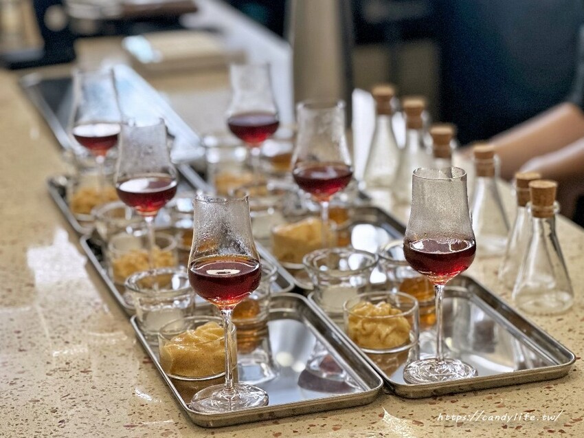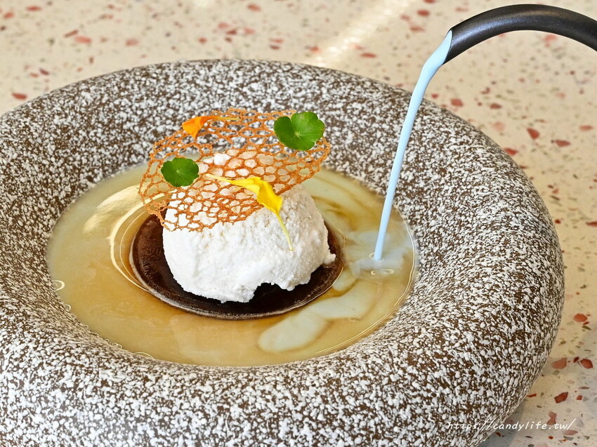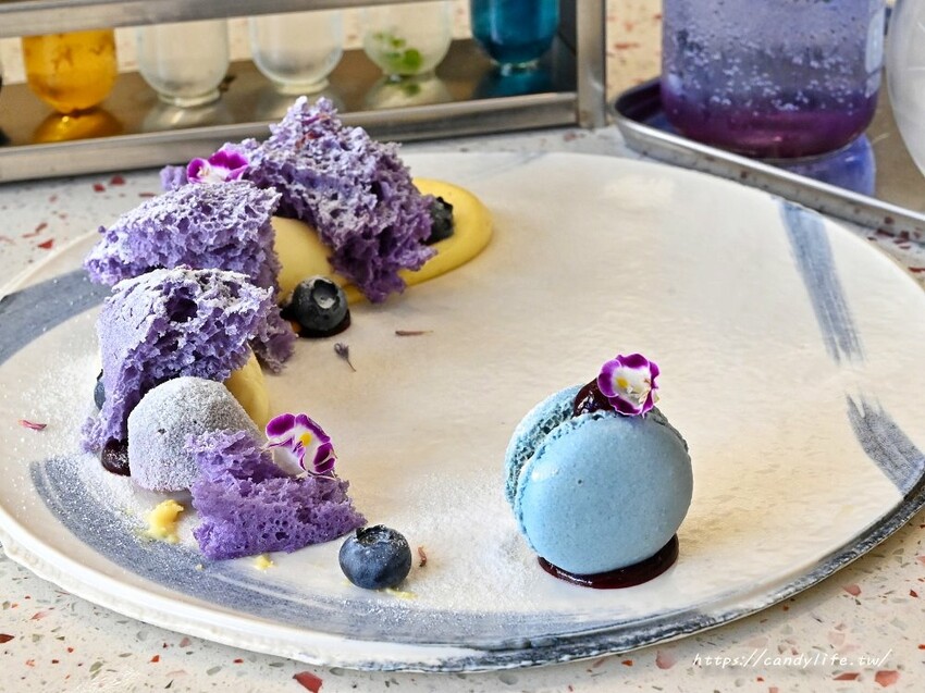 這款藍.星辰甜點也太美了!由CV甜點沙龍主廚料理,以甜菜根分子珊瑚礁蛋糕做為基底,搭配搭配藍莓慕斯、香草冰淇淋與鮮奶卡士達醬,佐上糖果甜菜根、黑醋栗庫利,搭配巴薩米克黑醋栗馬卡龍,最後添加矢車菊及紫夏錦妝點盤飾,整體吃起來酸酸甜甜的,清爽不甜膩