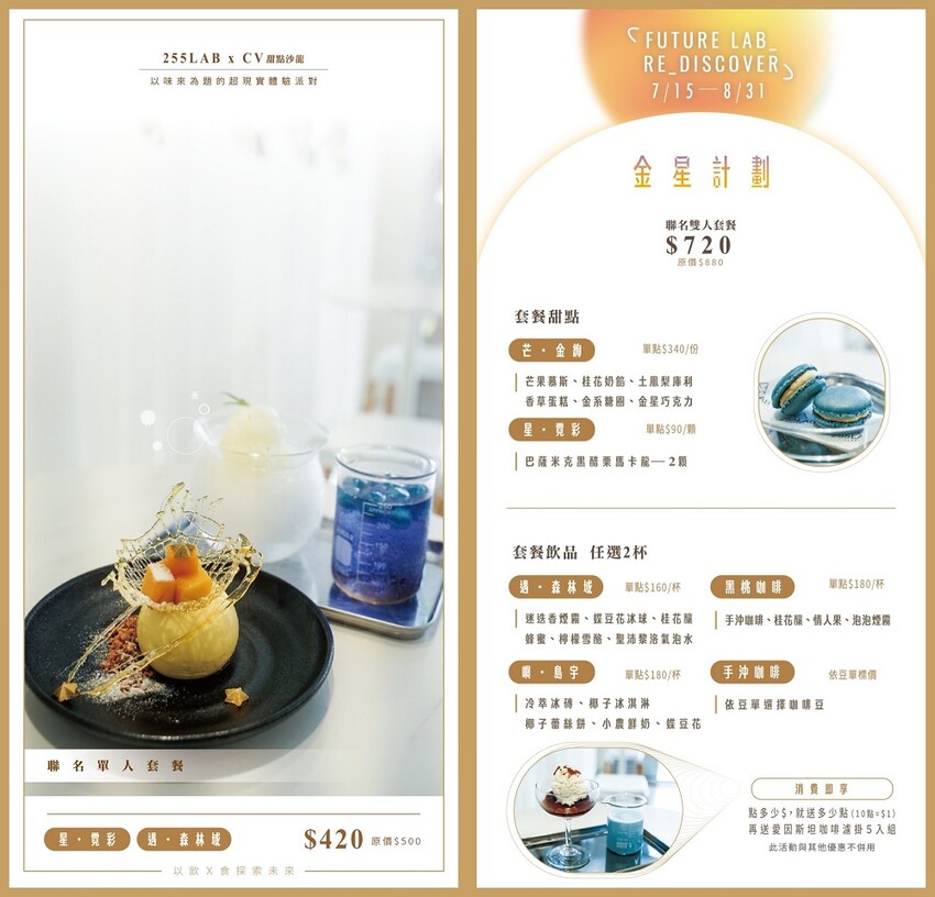 來到台中最美實驗室,跟糖糖來一場以「味來」為主題的星空派對吧,以實驗室為主題的255LAB café,這次與糖糖的愛店CV甜點沙龍聯名,於7/15-8/31推出《FUTURE LAB:RE_DISCOVER 未來的味來》,在充滿實驗性與想像力的小宇宙中,帶大家發現更多咖啡迷人的未來食況