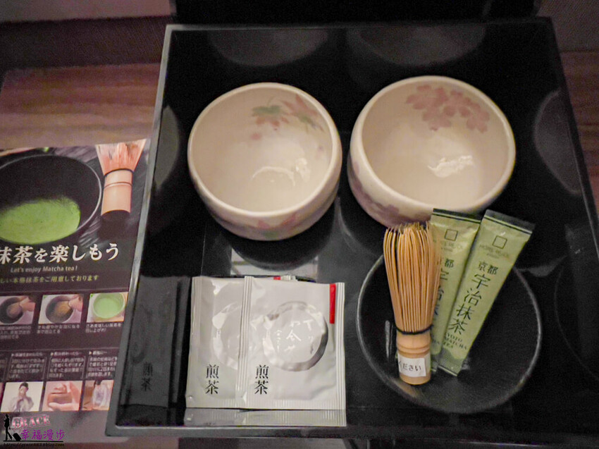 盒子裡面打開有著杯子、煎茶跟抹茶,還有茶筅(刷抹茶的工具),旁邊有放置說明書,可以體驗日式抹茶的樂趣。