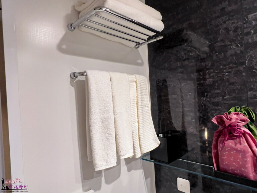 浴巾和毛巾就放置在此,小袋子裡面裝的是沐浴備品,很貼心的準備泡澡入浴粉,回到旅宿可以泡個澡消除一天的疲憊。