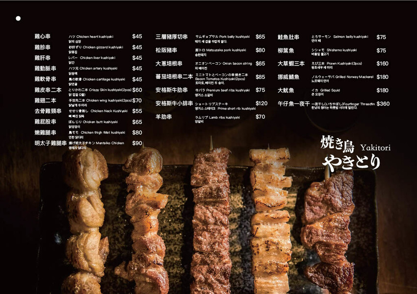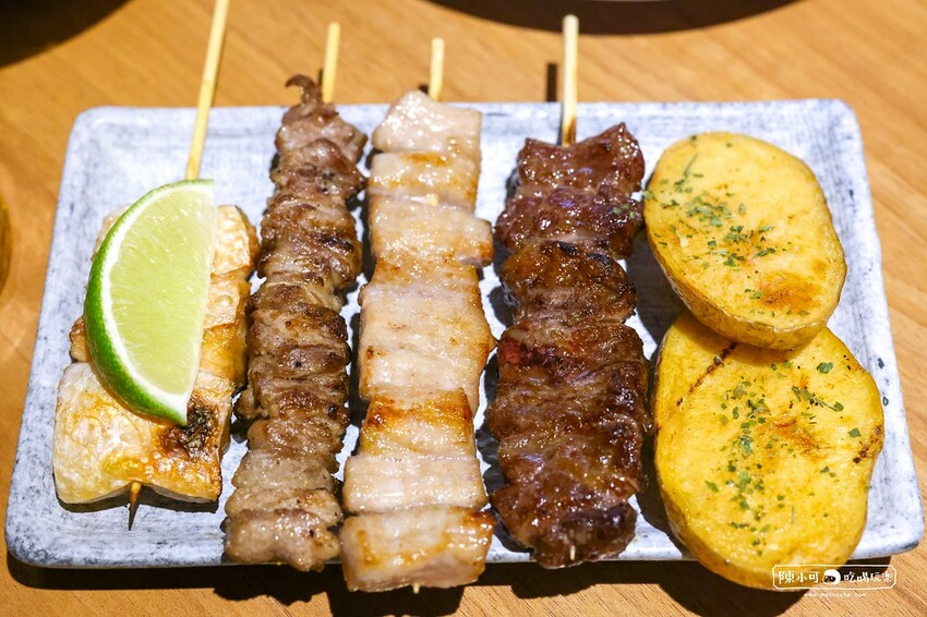 塭燒安格斯牛肋串、塩燒松阪豬串、爐燒嫩雞腿串、塩燒雞翅兩本、塭燒羊肋串、塩燒杏鮑菇串、爐燒香菇申、櫛瓜串、鮭魚肚串、奶油馬鈴薯、富士鮮味蛤、日式炸雞。