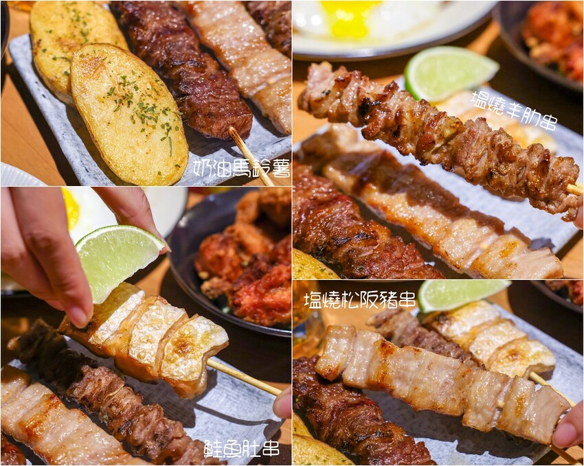 這盤奶油馬鈴薯、鮭魚肚串、塭燒羊肋串、塩燒松阪豬串和塭燒安格斯牛肋串。