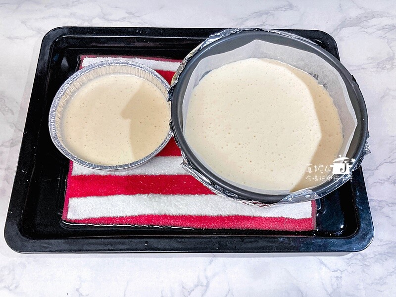 較大烤盤裡墊一塊布加烤盤1/2高度的熱水放入烤膜,移入已預熱180度C的烤箱裡