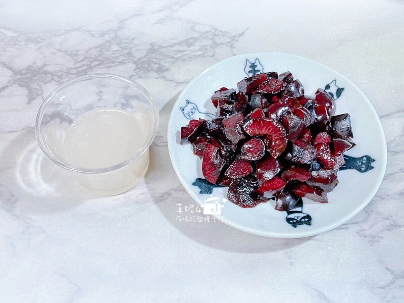 原本是想把櫻桃果粒打成果泥但是怕會減損櫻桃本色,最後決定去籽後切小塊保留櫻桃的存在感