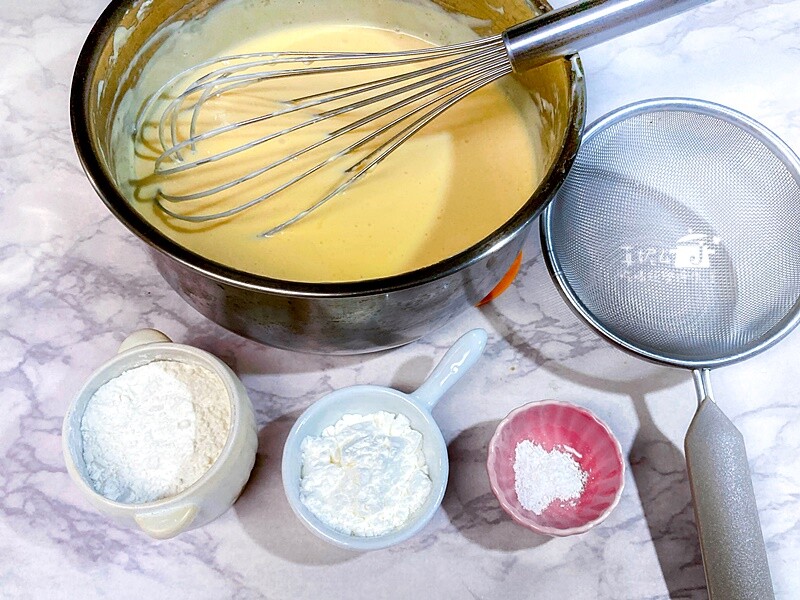 4. 由略高角度傾倒麵糊,用竹筷略攪拌可幫助消除氣泡