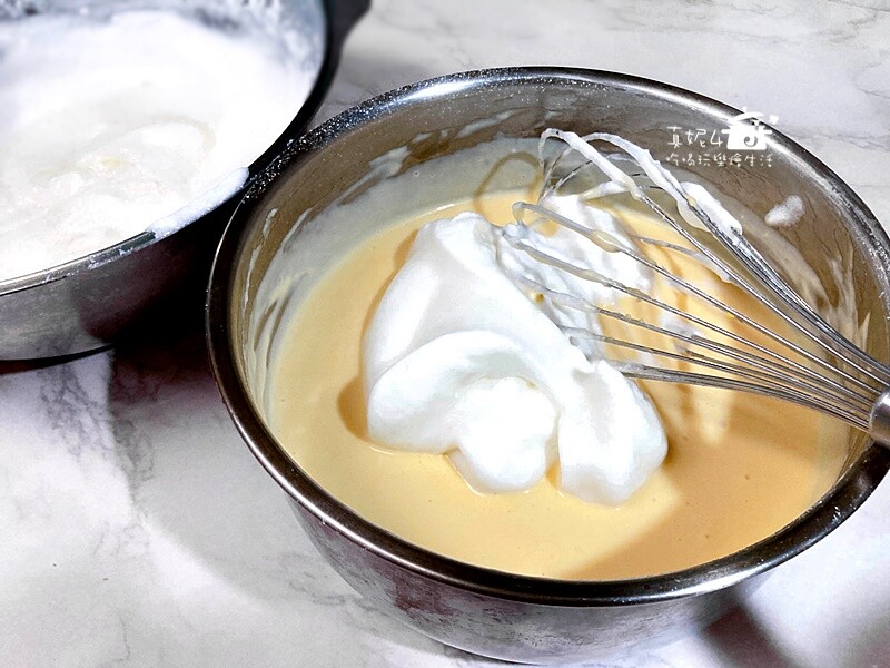 1.取1/3的蛋白霜和乳酪麵糊混勻後再將剩下的麵糊倒入蛋白霜裡快速且輕手的混勻