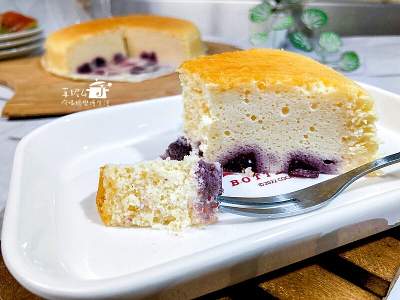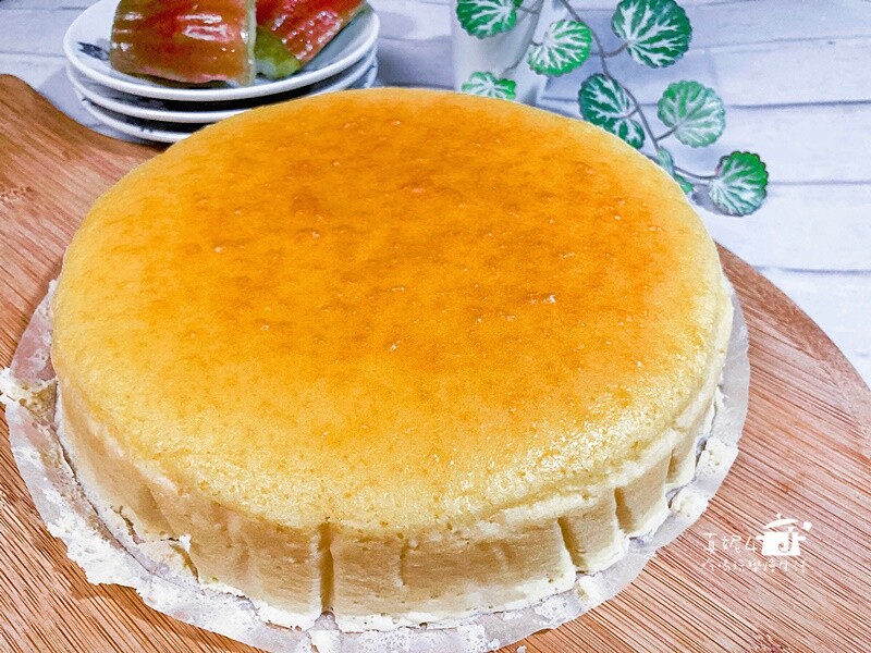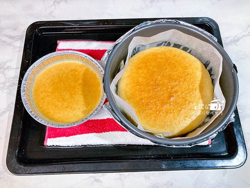 乳酪蛋糕不會像海綿戚風蛋糕一樣長很高,蛋糕表層有彈性不會一摸就塌陷的狀態就是熟了