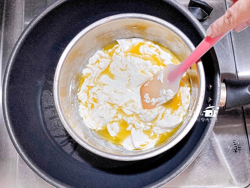1.奶油乳酪和無鹽奶油以小火隔水加熱的方式溶解後離開熱源,繼續用攪拌器充分混合