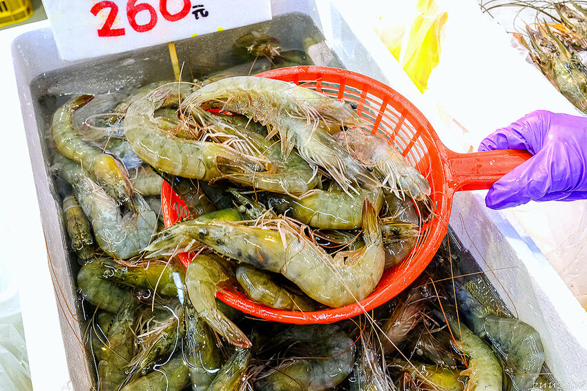 後面則是活跳跳的泰國蝦,同樣也有分大小隻的差別,現撈的泰國蝦每隻看起來都頭好壯壯,生龍活虎哩~
