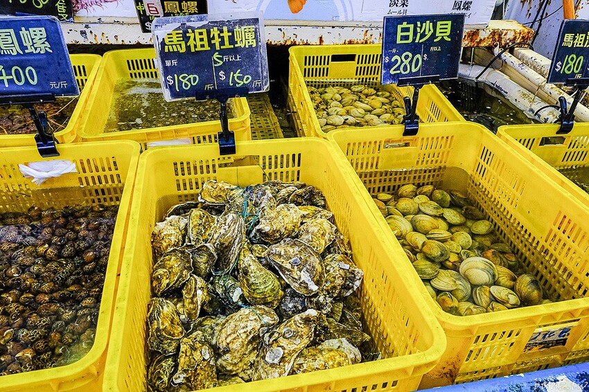 往裡面活體水產區,除了剛剛看到的馬祖牡蠣還有鳳螺、白沙貝等,另外也有水姑娘龍蝦、麵包蟹、波龍、鱈場蟹等相當豐富。