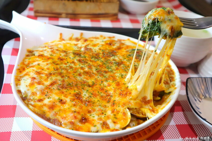 這個焗烤總匯海鮮紅醬咖哩飯我們加了雙倍起司,焗烤就是要滿滿起司才過癮阿,隨便一挖都大牽絲超級邪惡,裡面海鮮很多,有新鮮魷魚、鯛魚、蛤蠣、蝦子等,滿滿海鮮很對味,且紅醬加咖哩十分濃郁,還有海鮮一同熬煮,醬汁更加濃郁,且雙倍起司真的是畫龍點睛美味加倍。