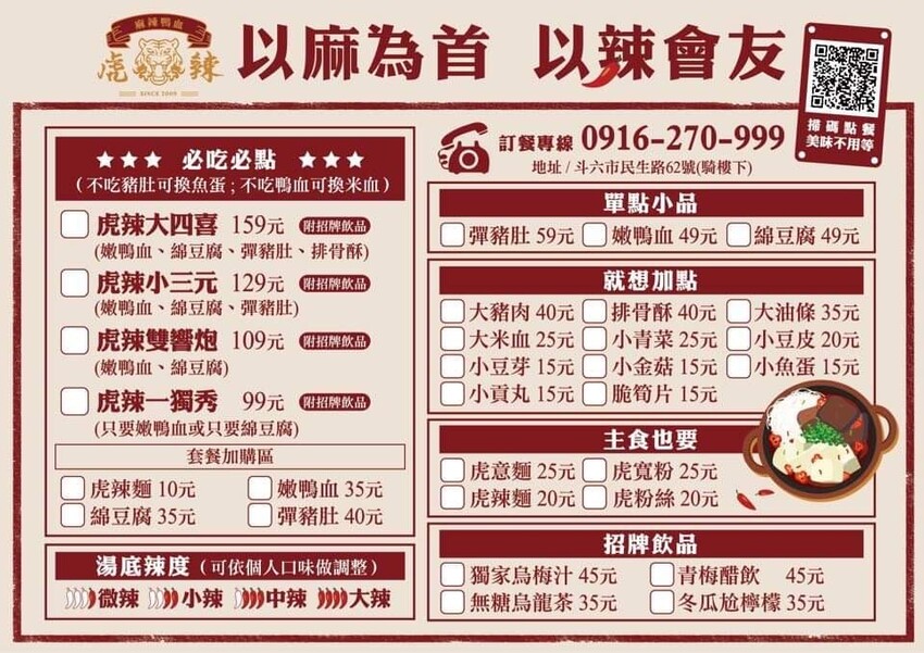 【虎辣麻辣鴨血】以麻辣鴨血料理為主打,供應四款套餐可挑選,配料有嫩鴨血、綿豆腐、彈豬肚和排骨酥等,也可以單點加料升級更豐富。