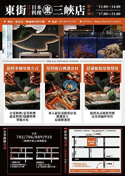 東街日本料理第一間創始店是在2007年6月,在新竹市的鐵道路上,目前新竹縣市、桃園市、台北市、新北市共八家分店,預計在今年年底還會在「青埔高鐵特區」展店,提供佔地1666坪的舒適用餐環境;這次來訪新開幕的【東街日本料理三峽店】就位在三峽老街附近的國光街上,是一棟三層樓的獨棟建築物,從外觀看場地相當大,東街的客人很多,場地不夠大是無法滿足客人的需求。周邊的停車位不少,除了門口就能停車,對面也有付費停車場,鄰近還有東街的特約停車場。