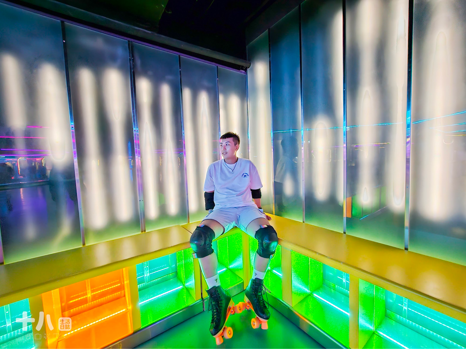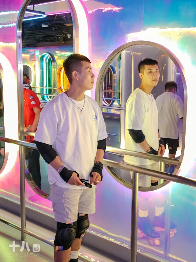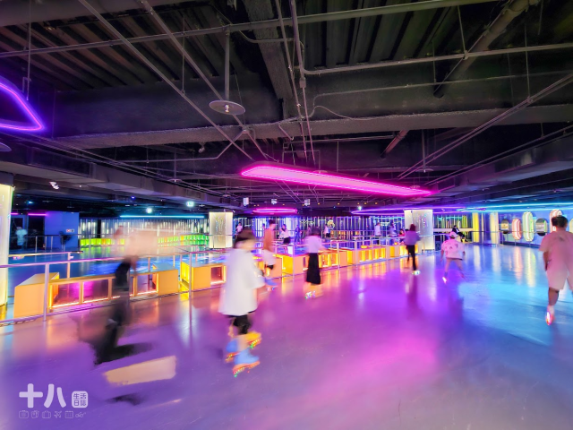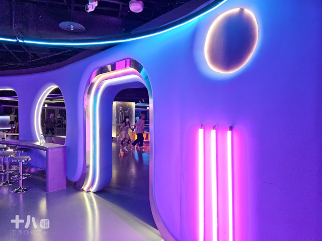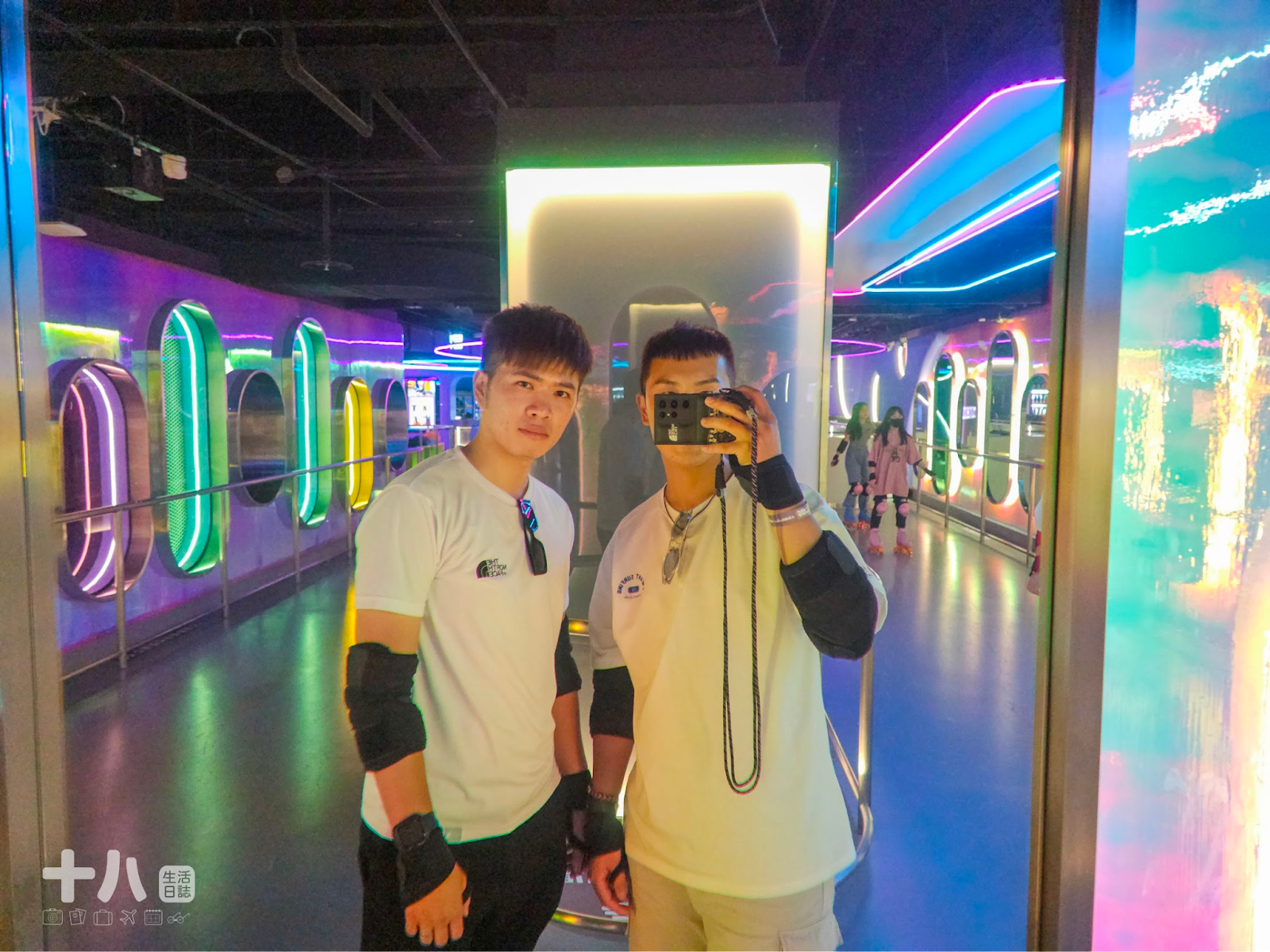 練習區風格走的是彩色螢光風,除了很好拍照外,一個邊邊都有欄杆可以扶,對於初學者來說真的非常受用,欄杆可以提供額外的支撐和平衡,讓初學者在滑行時更加穩定。對於剛開始學習滑輪的人來說,這是一個很棒的設計,能夠在安全的環境下練習和進步。
