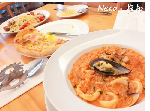 卡布里喬莎的餐點種類非常多元,如果一時半刻不知道怎麼點餐的,就跟我一樣,跟著店家活動走,這《套義遊味盡》期間限定品項:有披薩、燉飯、義大利麵,活動期間,點其中一樣即贈「義饗三色冰淇淋」壹份。