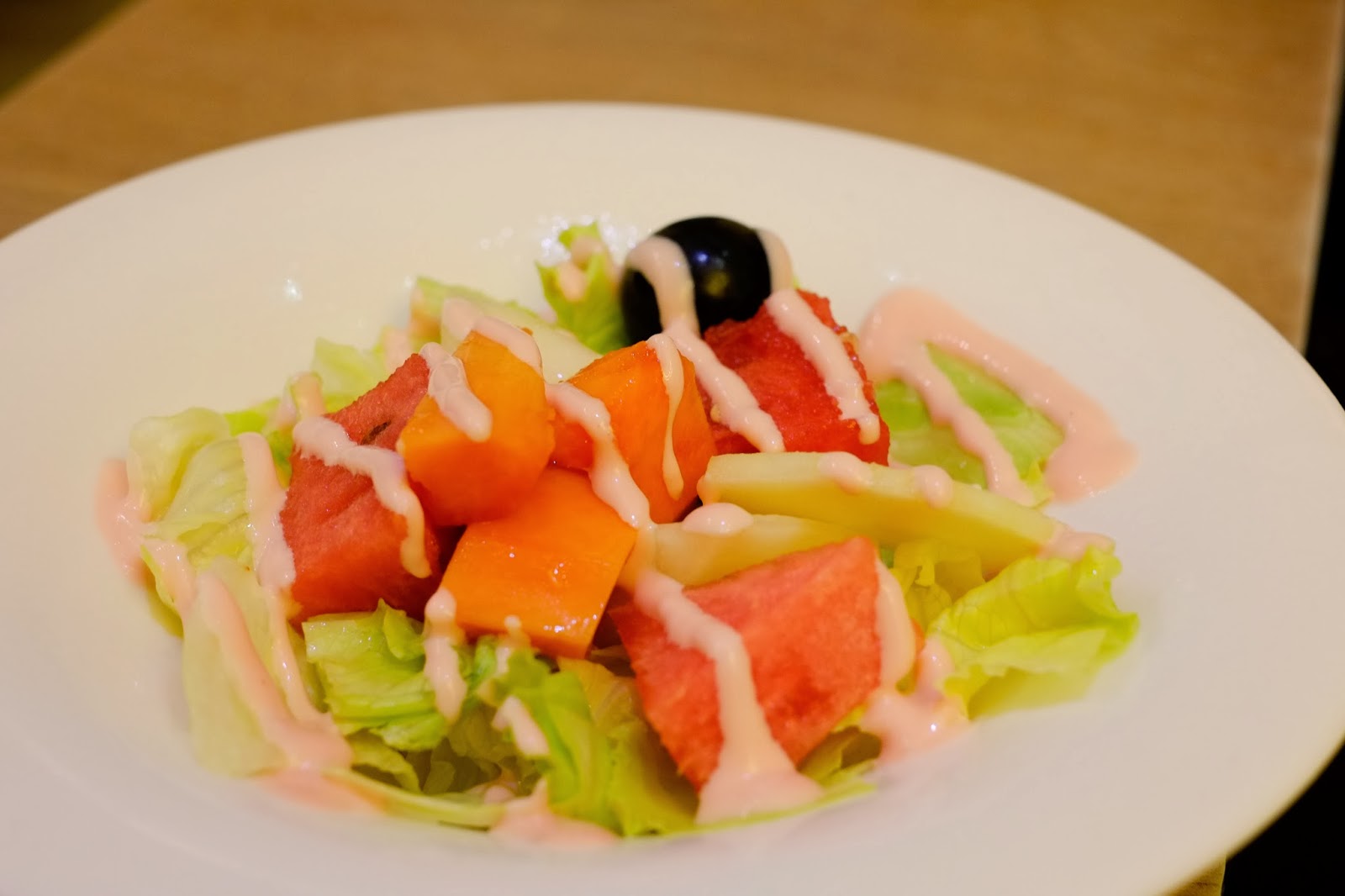 水果優格就是水果加生菜,淋上甜甜的優格醬,水果很甜,跟木耳是完全不一樣的口感。一甜一鹹,完全是不同取向