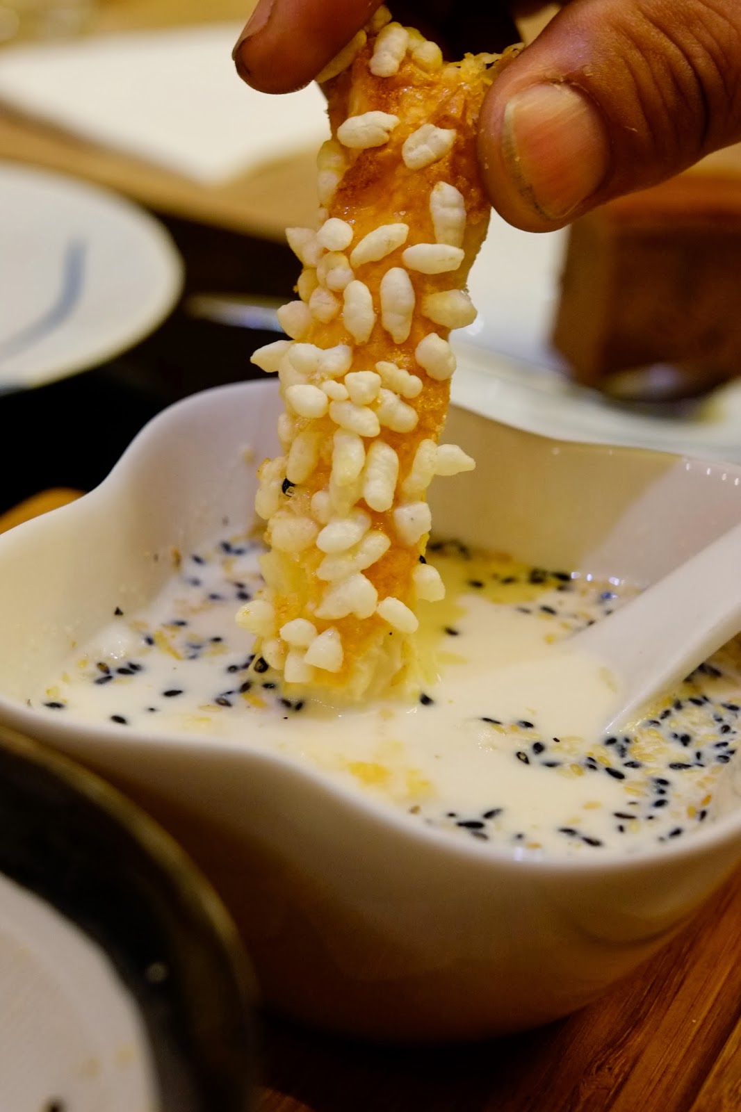 杏仁茶推薦喝熱的,除了也有芝麻可以磨,還附上千層酥可以沾,難得不是附油條。杏仁味雖重,但喝起來不刺鼻,淡淡的杏仁味道上來不錯。