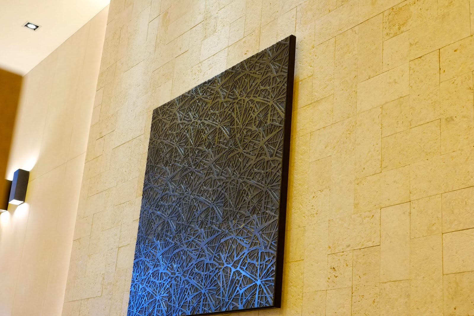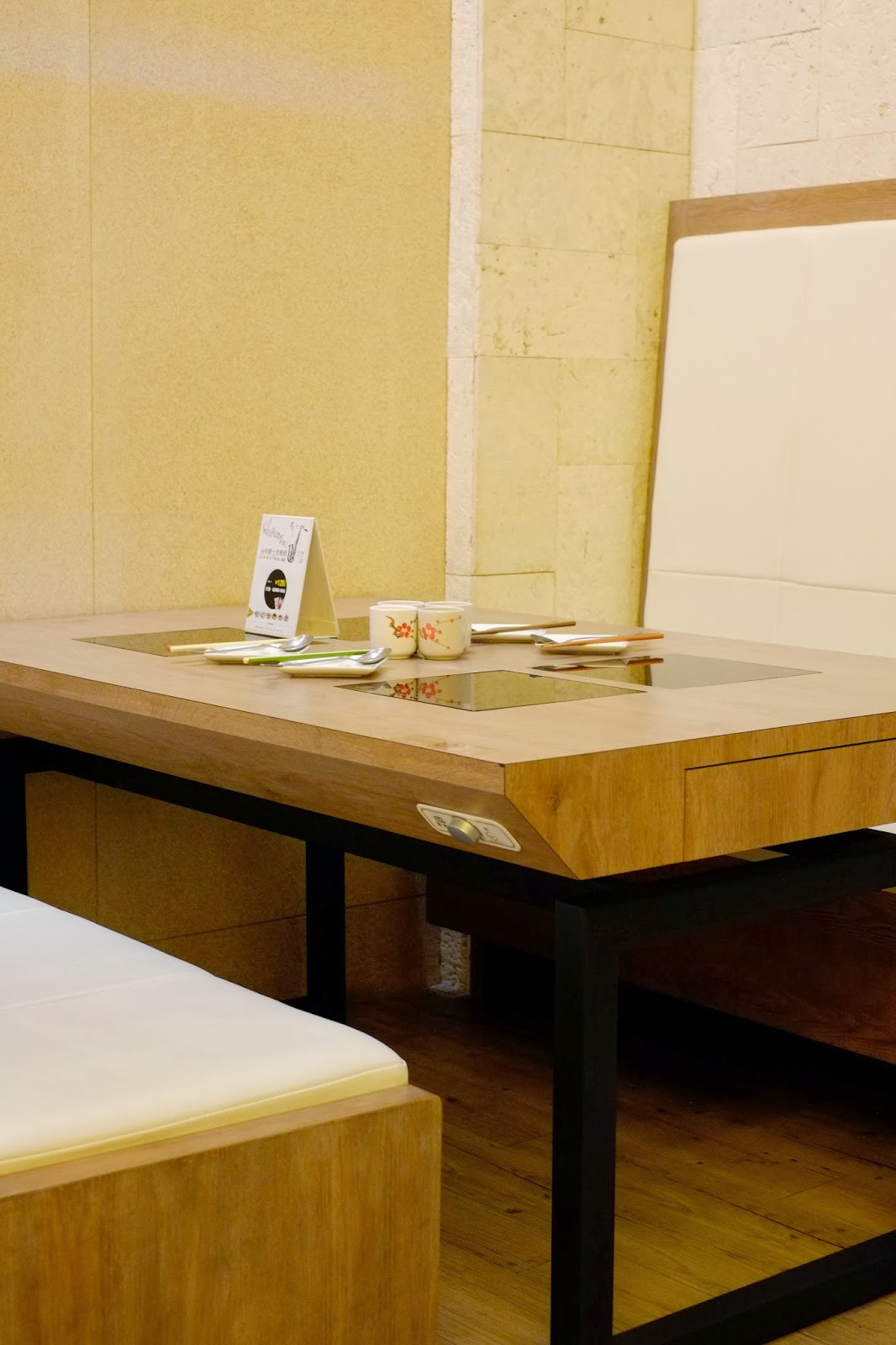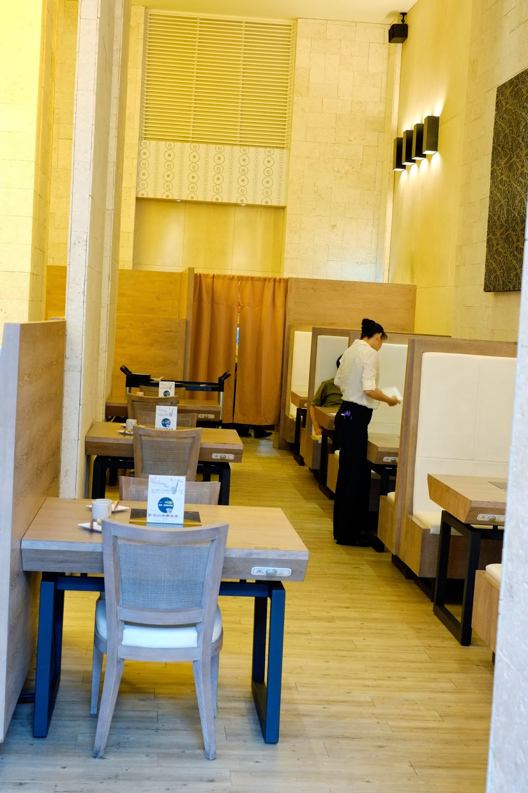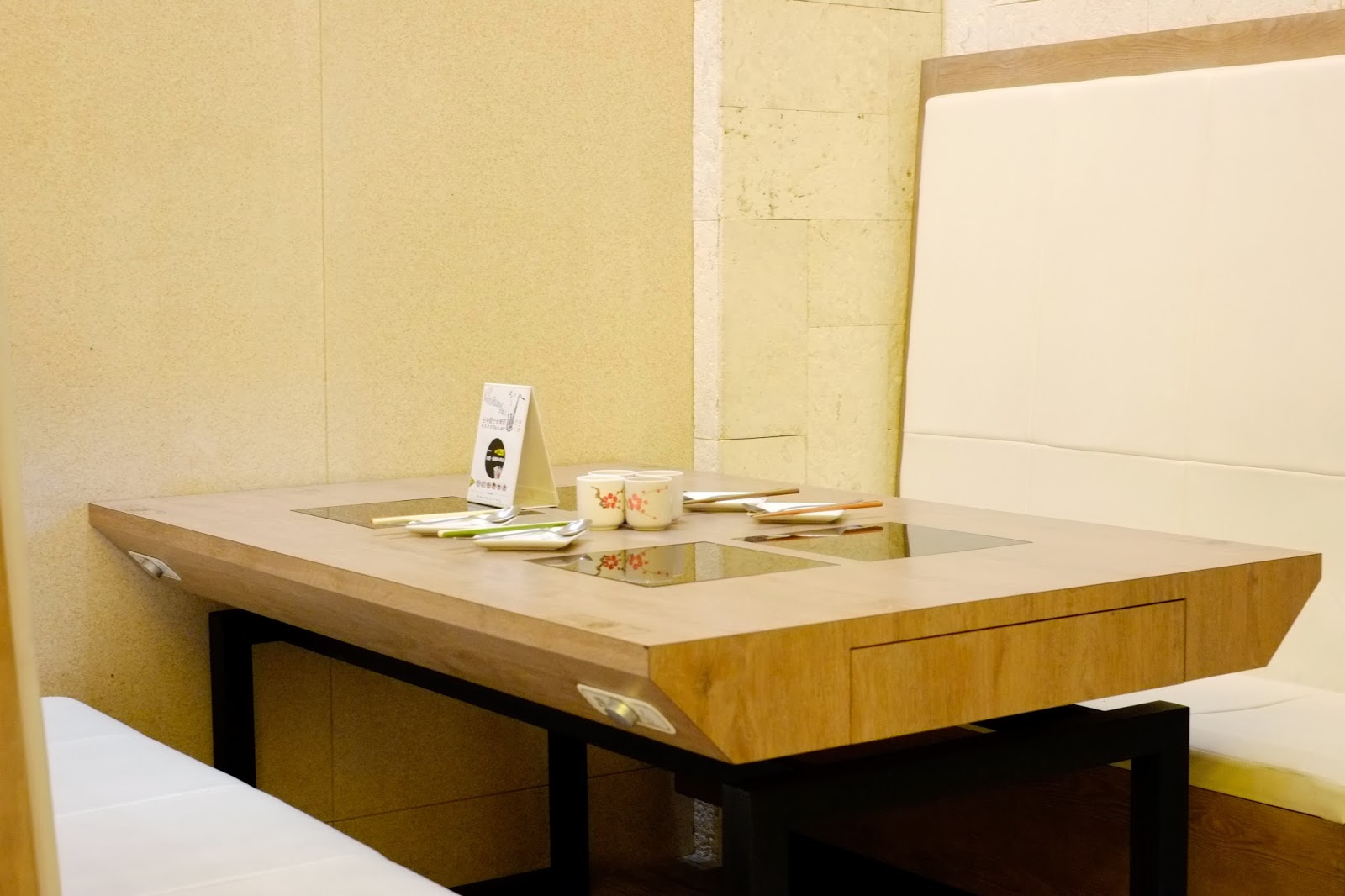 對室內第一眼就是很舒服,優雅中帶點壯闊感,因為整個挑高很多!跟台北的樓中樓不一樣,沒有壓迫感。椅子也加高,雖然左右還是會看到,但是前後遮蔽起來也多了一份隱密跟獨立性,櫃台有放一個可以玩遊戲的轉盤?