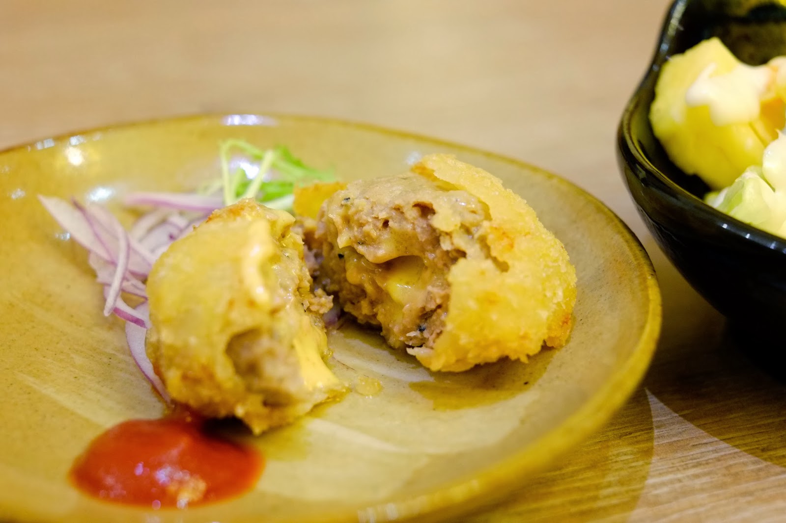 牛肉起司,牛絞肉包著起司去油炸,切開會有潺潺的起司流出,一定要趁熱吃享受牛肉與起司交織在一起的美味。