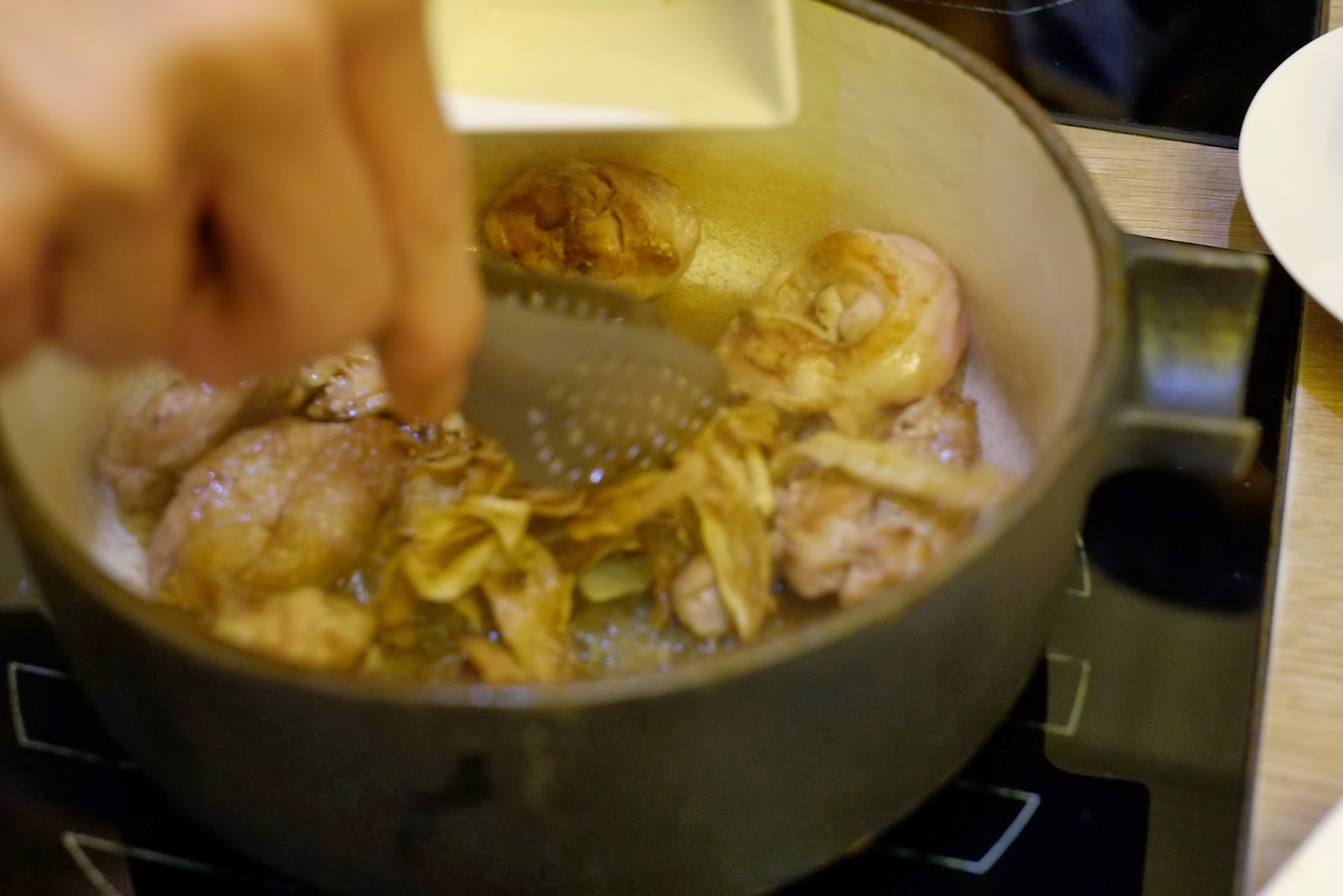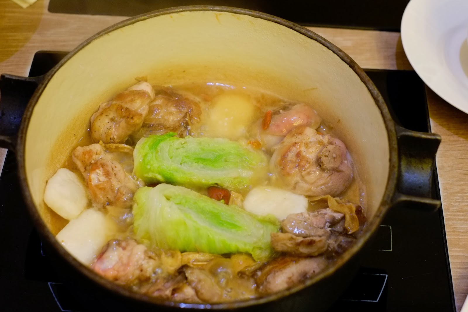 紹興雞酒燒,主廚會在桌邊服務示範,裡面先放好雞肉,用2種薑片爆香,倒入紹興酒,還有紅棗枸杞,放上白菜捲,最後淋上高湯在加入寧波年糕,煮一下子就大功告成。可以看表演還挺不賴的,帶有一點酒香的雞肉頗入味,加上薑片的香氣傳來,寒冬吃應該會更享受。雖然酒味不重,還是要說開車不喝酒,喝酒不開車