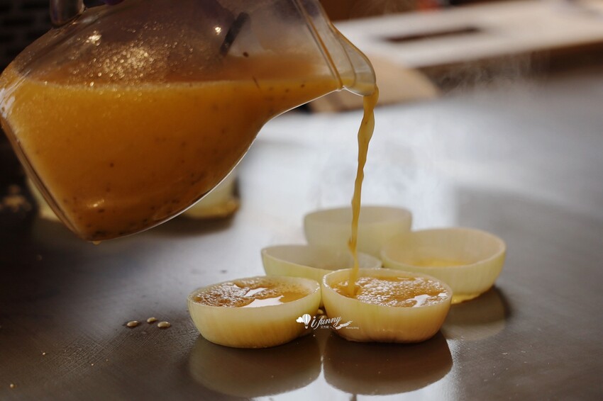 先以洋蔥為容器,將事先調好的蛋液淋到洋蔥中。