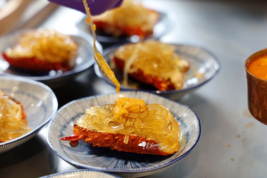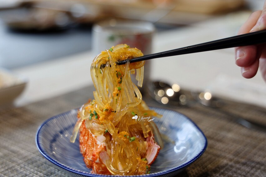 龍蝦頭裡還有一些蝦膏,所以建議大家要將葛粉稍微攪拌一下,讓海膽魚卵醬及蝦膏,都能裹附在Q彈的葛粉之上,入口後滿嘴都是鮮香海味。