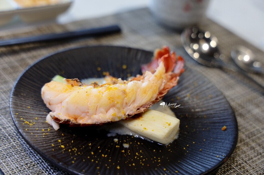料理台上會將當日食材展示出來,新鮮的程度是以肉眼就可以辨識的。包括澳洲活龍蝦、生食級干貝、時令現流漁貨,全都是產地直送或當天海釣回來價格均為1600元加一成服務費,餐點內容豐富,能品嚐到龍蝦和熊本A5和牛或桂丁雞,性價比超高。