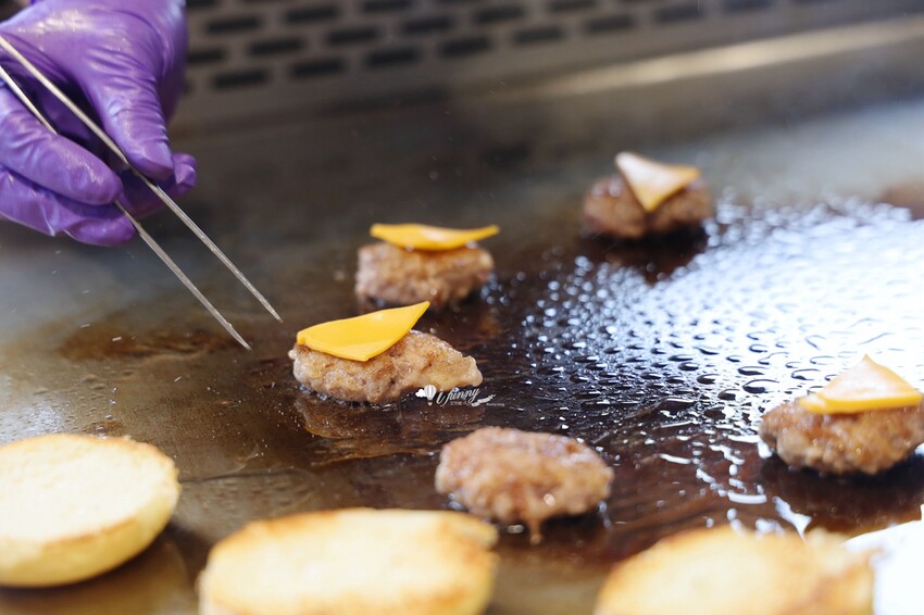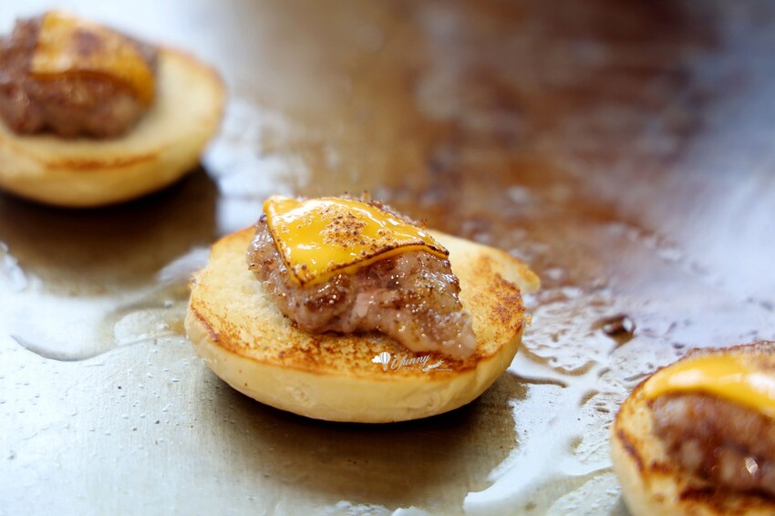 和牛在高溫下外表變得赤黃焦香。放上黃澄澄的起司片,更加地誘人!