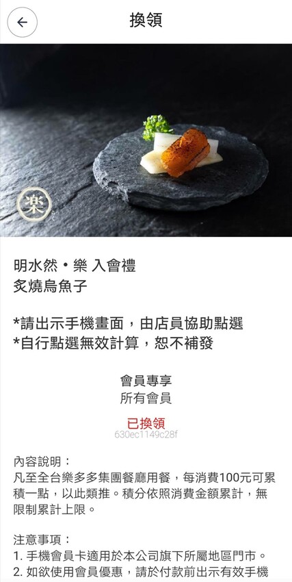 這道是下載樂多多APP的 入會禮,只要將畫面給服務人員看過,就能免費換領。厚實的烏魚子與蘋果片、白蘿蔔片一起入口,滿嘴都是烏魚子的鮮香。
