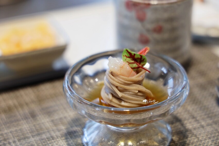 第一道甜蝦橋麥麵,搭配日式和風醬油,麵條口感軟綿,甜蝦鮮美紮實,清爽開胃。