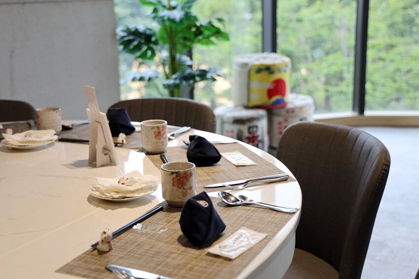 明水然・樂每個人的座位上都是佈好餐具,餐巾折成一件小和服的模樣,跟想傳達日式風格的理念很一致。