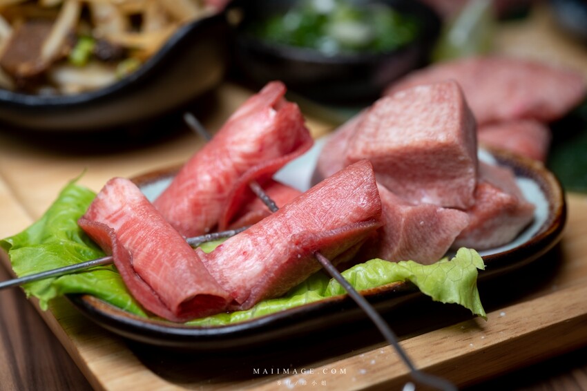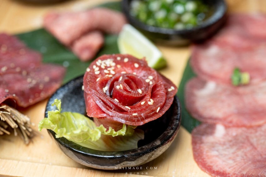 ▲這盤牛舌真的很用心,沒想到牛舌可以擺成玫瑰造型,平常看到的都是松阪豬這玫瑰牛舌還是頭一次看到。這個要烤的時候,為了避免火候過頭影響牛舌口感,服務人員會在桌邊服務專門協助烤牛舌,這真是太開心。一朵花可以分成10多片。