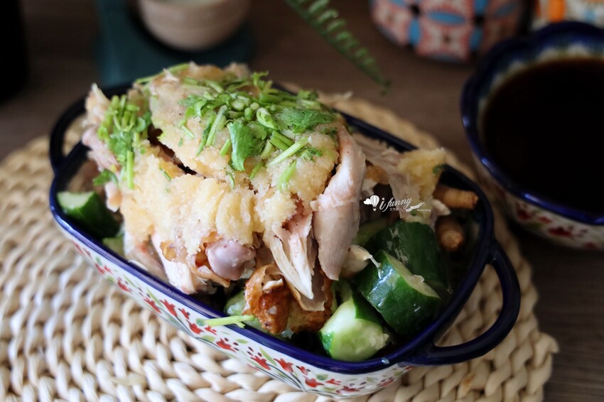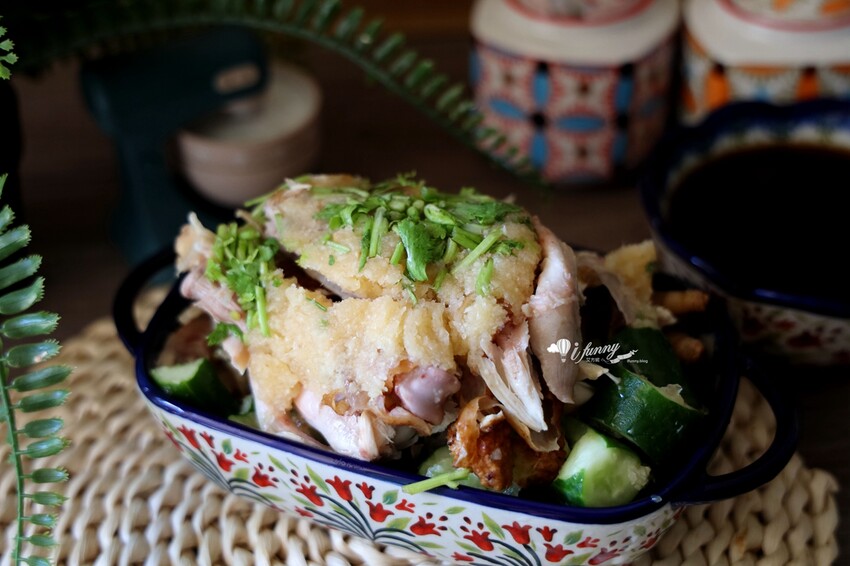 先烤後蒸的雞肉,雞皮帶著烤過的色澤及香氣,手撕的雞肉還有自然形成的雞汁凍,入口滿滿的蒜香、雞汁凍的入口即化,加上雞肉軟Q滑嫰,真的很推薦喔!