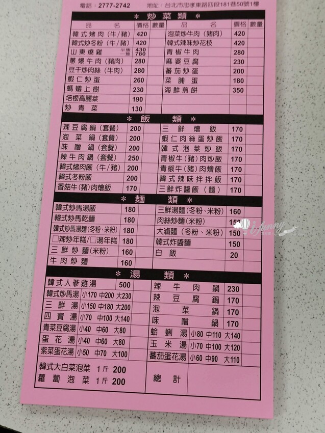 山東韓中小館 菜單 Menu價目表