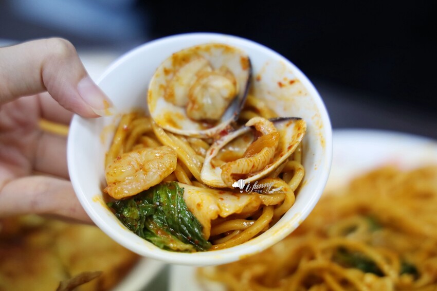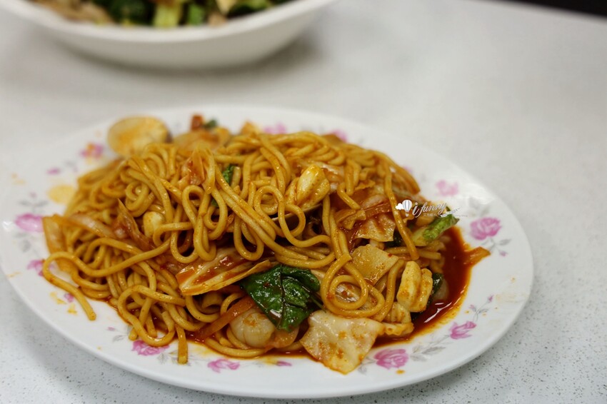這就是一般的炒瑪麵,但湯汁沒有那麼多。加了蝦仁、花枝、蛤蜊及青菜。
